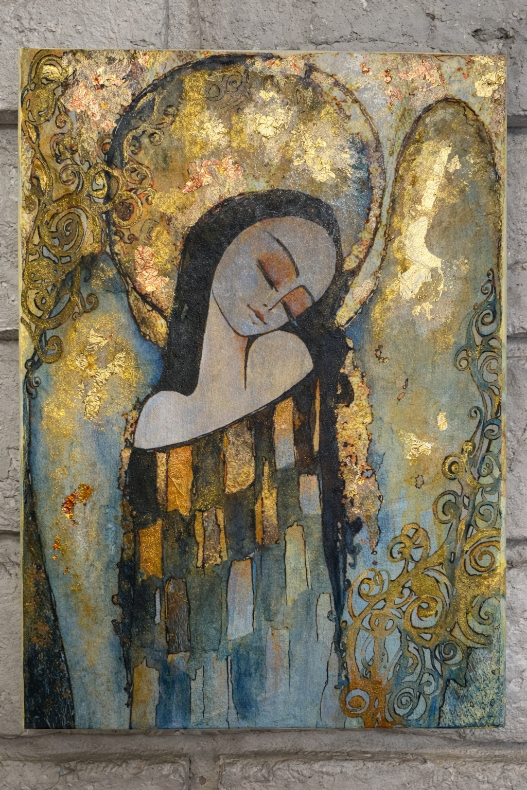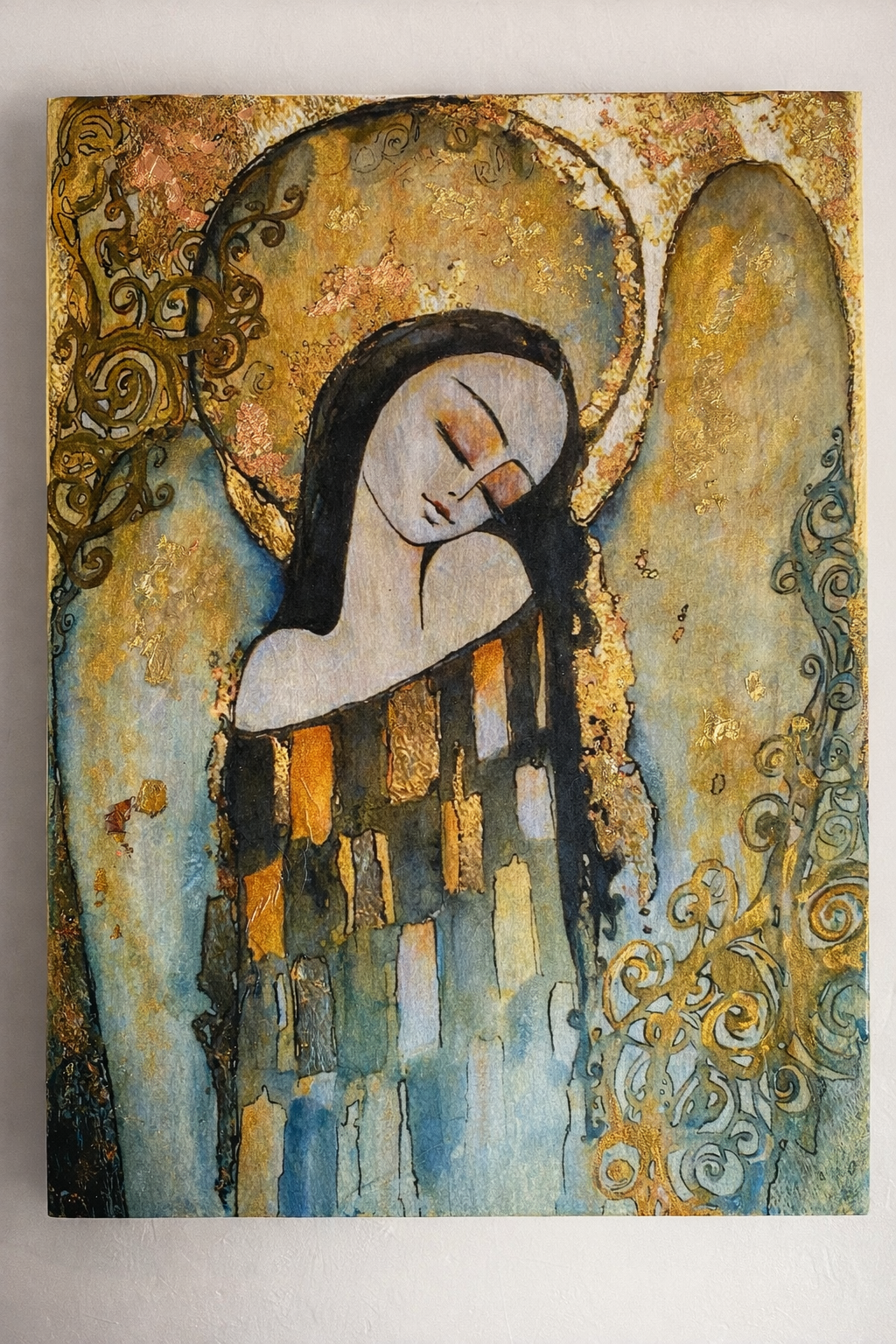 Wyjątkowy, ręcznie wykonany obraz przedstawiający anioła o spokojnym, refleksyjnym wyrazie. Subtelna postać z zamkniętymi oczami otulona jest ciepłymi odcieniami złota, beżu i turkusu, które tworzą harmonijną, elegancką kompozycję.
