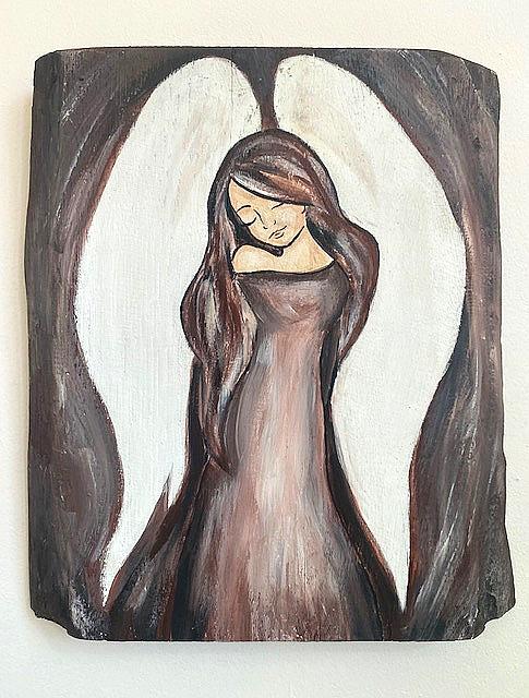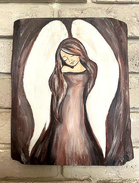 Ręcznie malowany anioł na drewnie – 29 × 27 cm