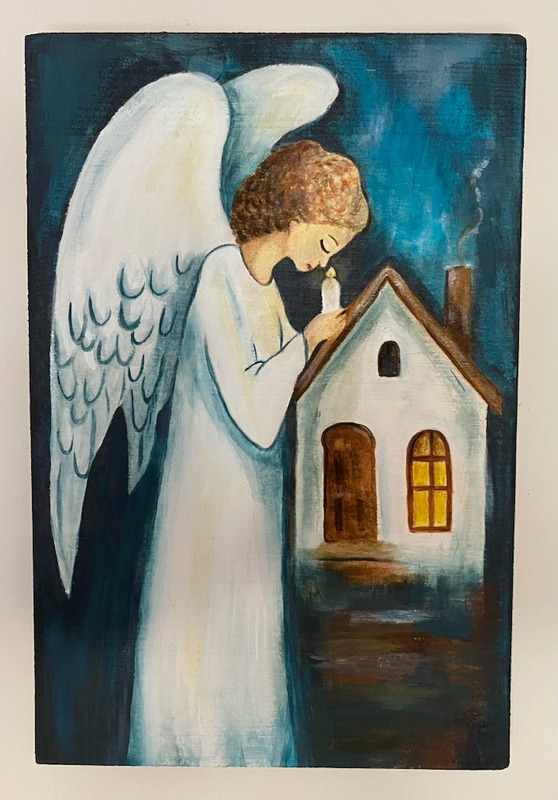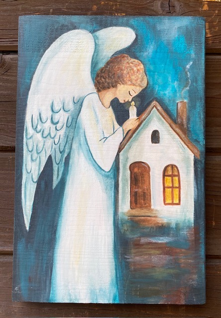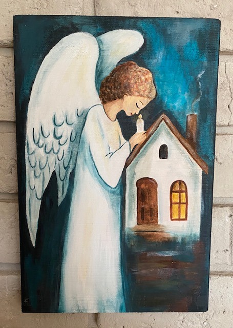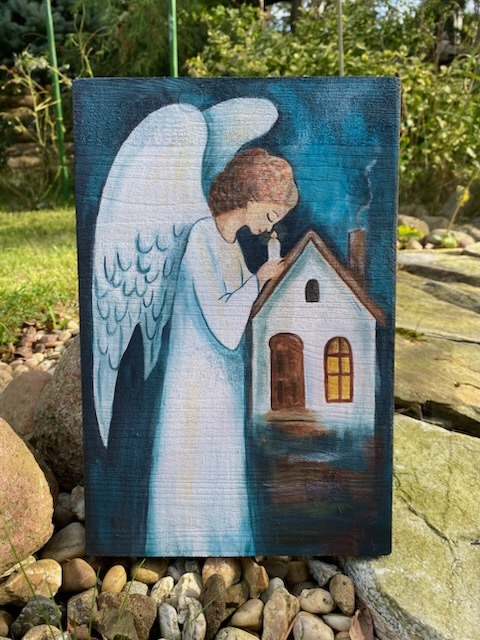 Obraz anioła akryl na drewnie 35x30 cm – rękodzieło, dedykacja gratis został dodany do koszyka.